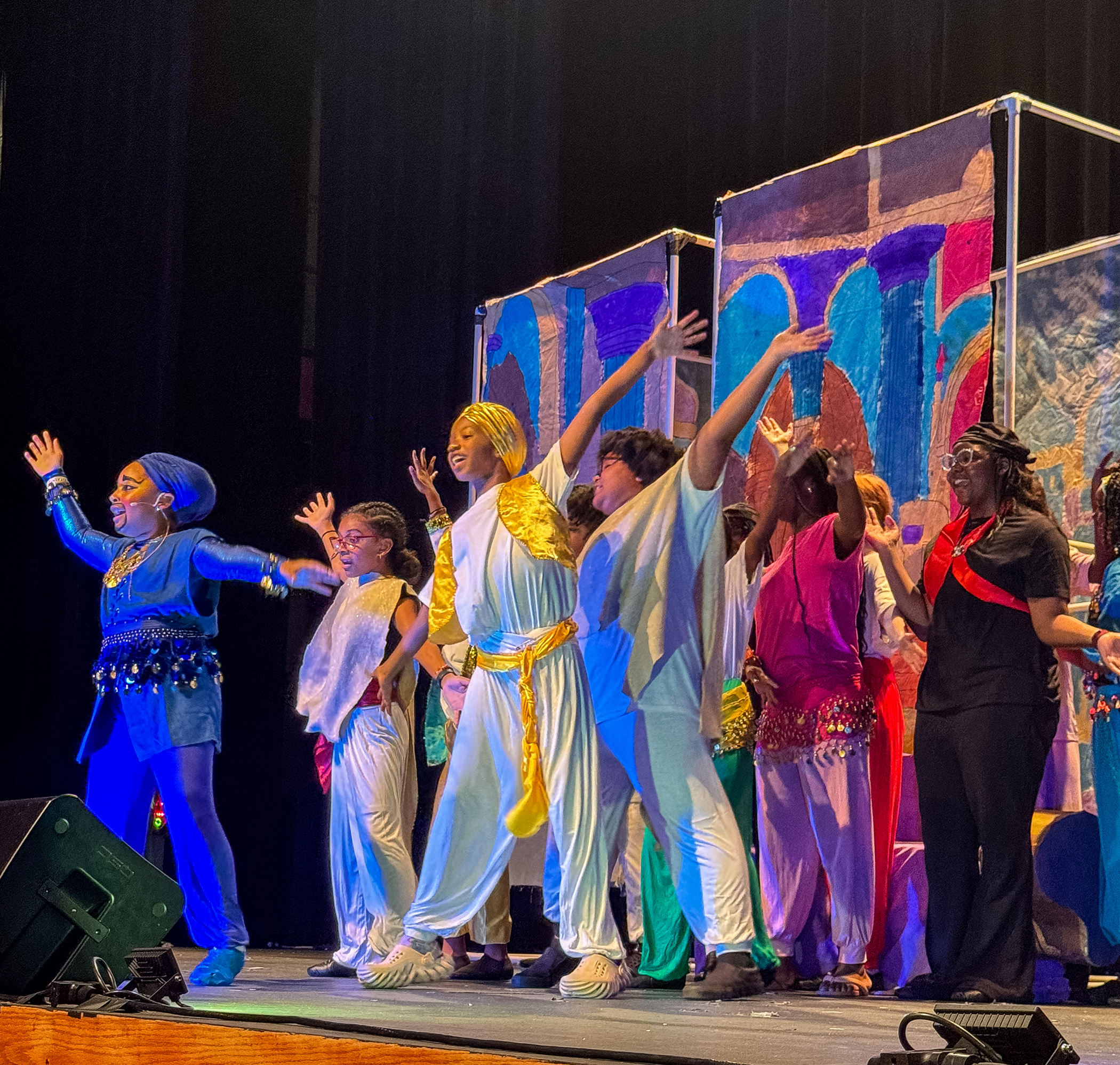 A rising sixth grader in the set design track, Wilbert worked on design for the Cave of Wonders scene. Wilbert’s favorite part of the camp experience was seeing firsthand how his work could enhance the performance. He also really liked learning to code using Legos. “Basically, it was like coding blocks, and you just put them together and when you click ‘start’ it makes it move. There are motors inside the Legos,” Wilbert said.
