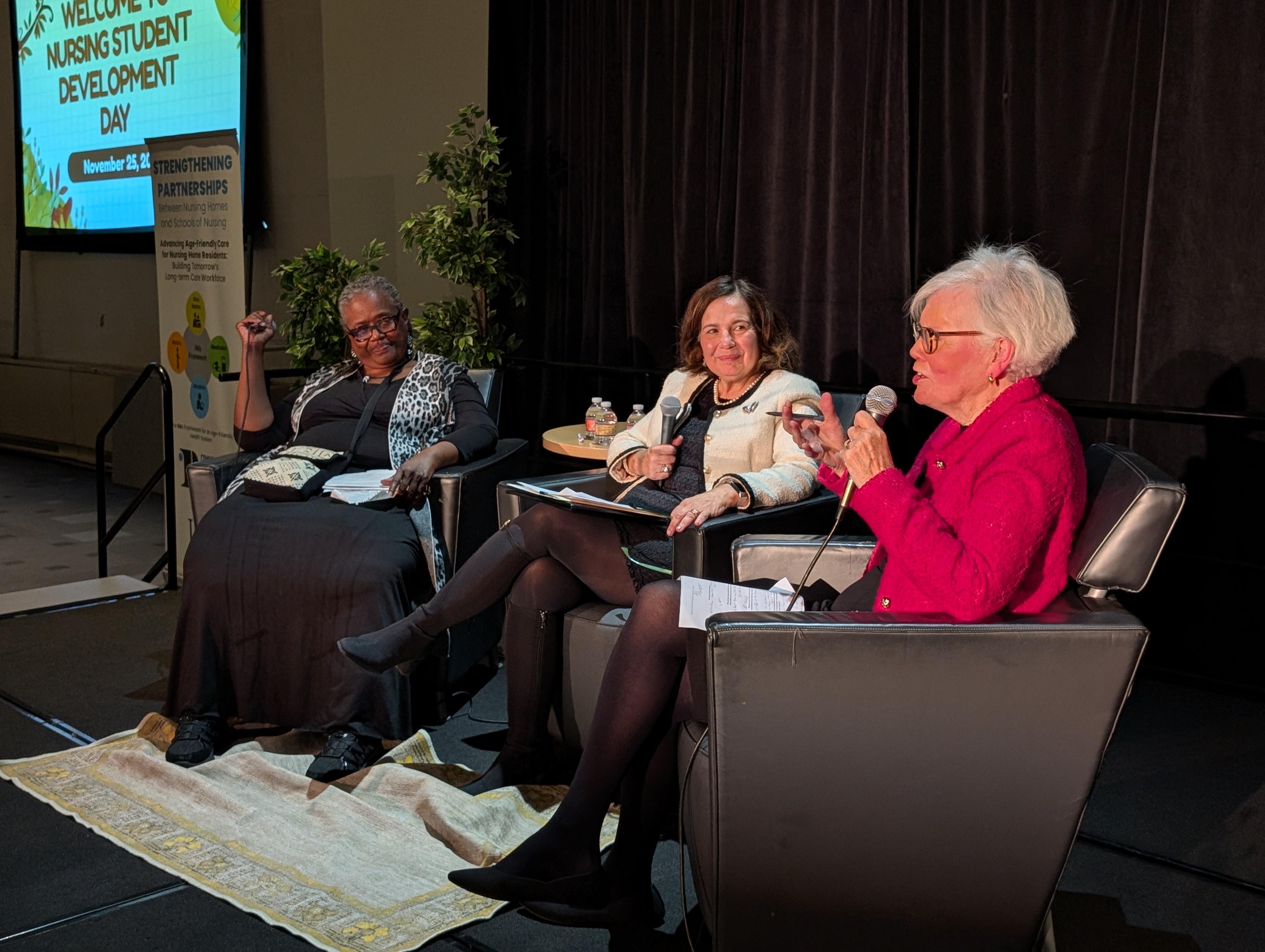 The keynote conversation was led by Dr. Laureen Tavolaro-Ryley, professor of Nursing and the Independence Foundation chair in Nursing at CCP, and featured Dr. Elaine Tagliareni and Rhonda Carter. Dr. Tagliareni is a former professor of Nursing at CCP, the College’s first Independence Foundation chair, and current professor emerita in the School of Nursing at the MGH Institute of Health Professionals. Rhonda Carter is a psychiatric nurse practitioner at Philadelphia Health Management Corporation.