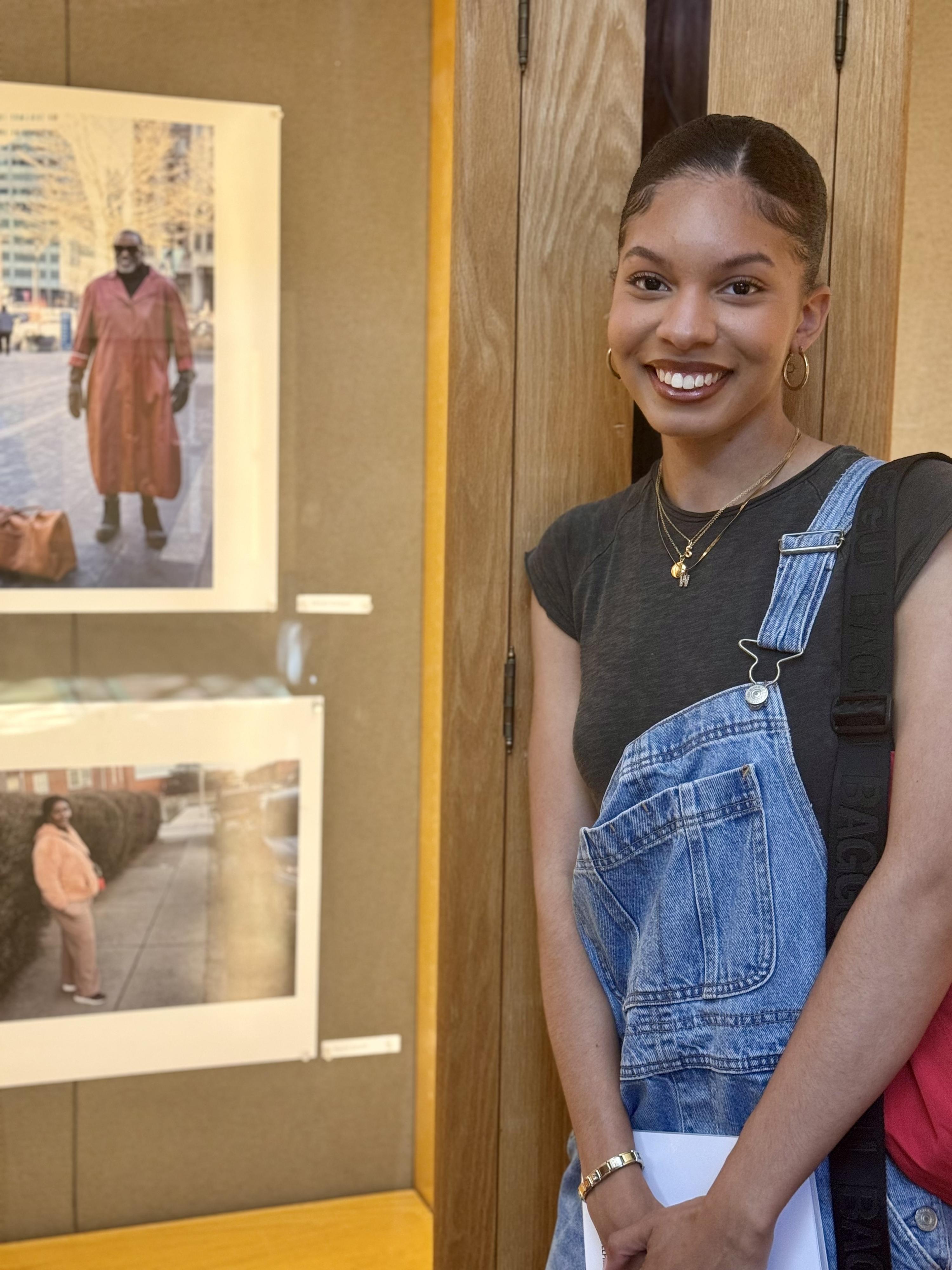 Students from across campus are invited to submit their photographs for inclusion in the zine, and Hannah encourages them to approach this project in the same vein as the inspiration, Jamel Shabazz. “Students always kind of have a harder time approaching a stranger,” Hannah said. “So, I see this as the catalyst of them approaching people they’ve never met before.” Sanaa Desper, a student in the department, said she was nervous to ask people at first. “I was shooting in between classes and doing a loop around City Hall, and I saw this guy in a red jacket,” Sanaa said. “I was scared that if people were around when I went up to him and he said no, that I would feel embarrassed.” But Sanaa mustered up the courage to ask him once there were fewer people around. And she’s so glad she did. “When I asked him, he was like, ‘Of course! How should I pose?’”