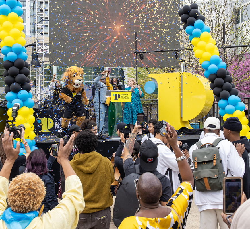 Hundreds of students, staff and friends of the College gathered at Main Campus for the unveiling of Community College of Philadelphia’s new brand on April 11, featuring guest speakers Rep. Jordan Harris, spoken word poets Dr. Michelle Myers and alum Eboni Ferguson, and alum Mutha Knows of Power 99, who served as emcee.